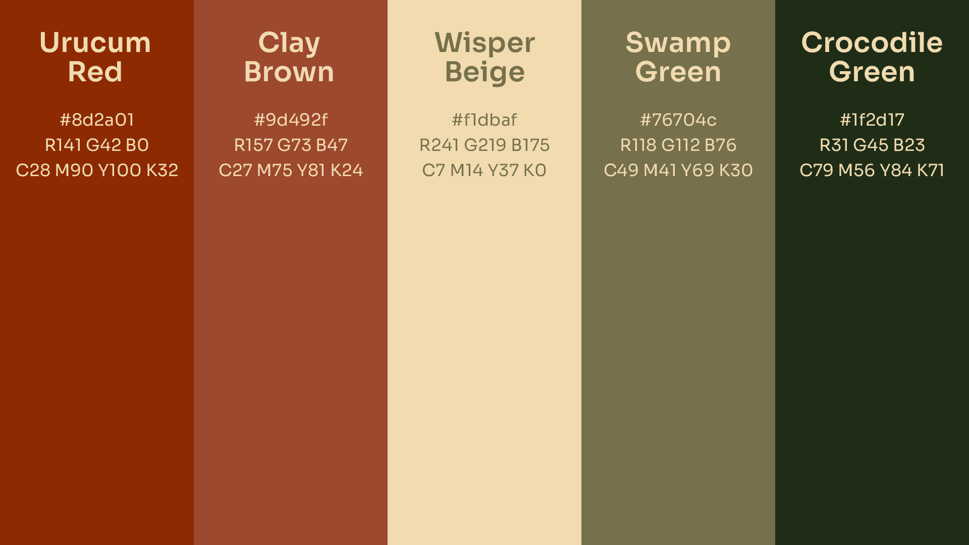 The color palette draws directly from the Amazonian landscape: earthy browns, clay tones, mossy greens, muted sand, and soft botanical neutrals. These hues intentionally distance the brand from the conventional tropical beach aesthetic, replacing turquoise blues and bright corals with forest soil, riverbanks, leaves, and shaded water.
