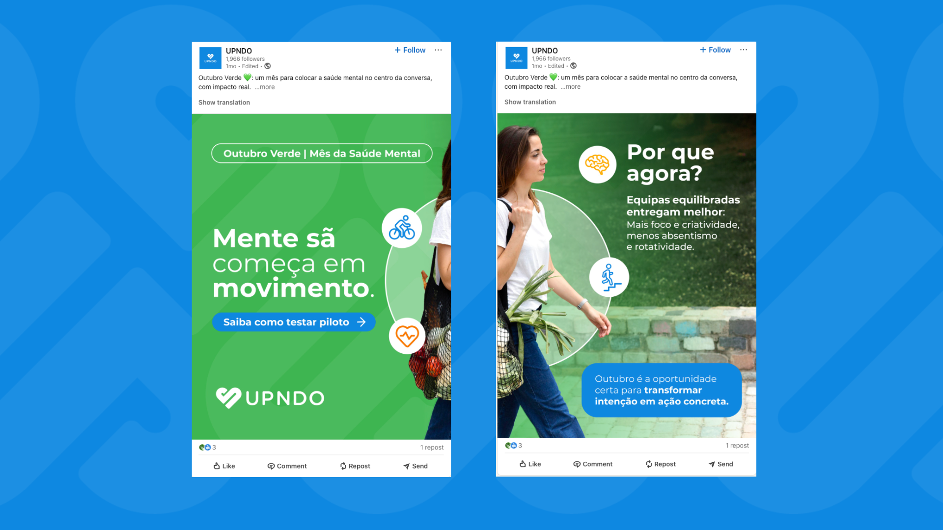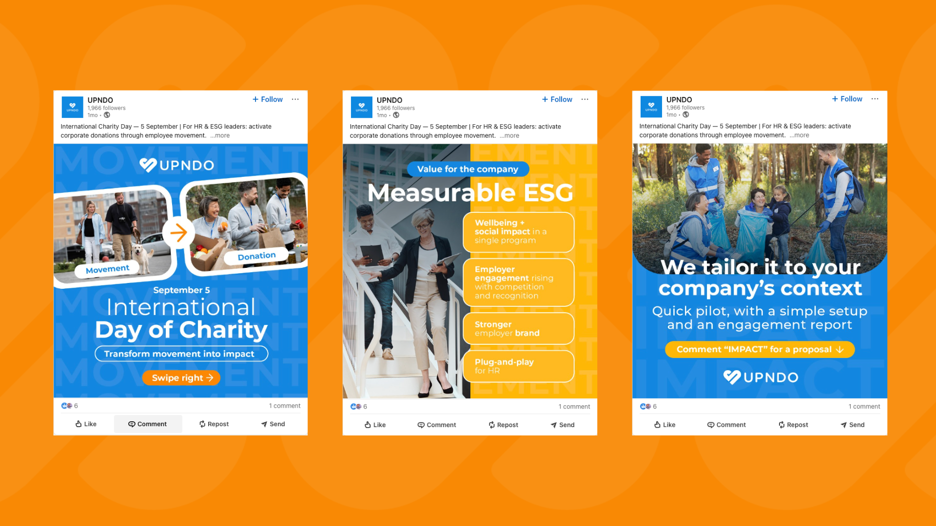 UPNDO is a startup that focuses on employee movement for a better mental and physical health. As their main product is targeted towards the B2B market their main audience is on Linkedin, so together with the Marketing team, we created a new visual identity and brand guidelines to be followed on all their new visual communication, focusing on bright colours, real people and actionable change from employees.